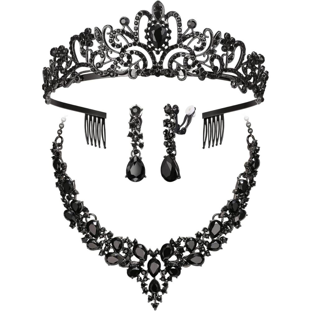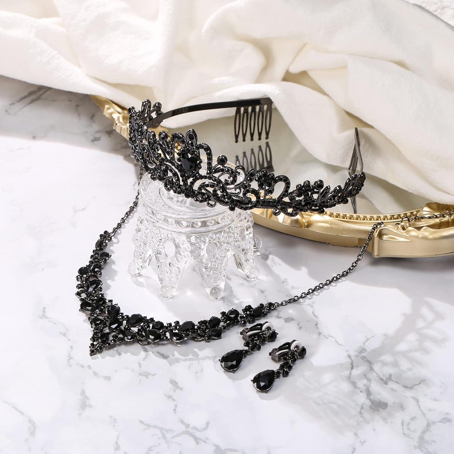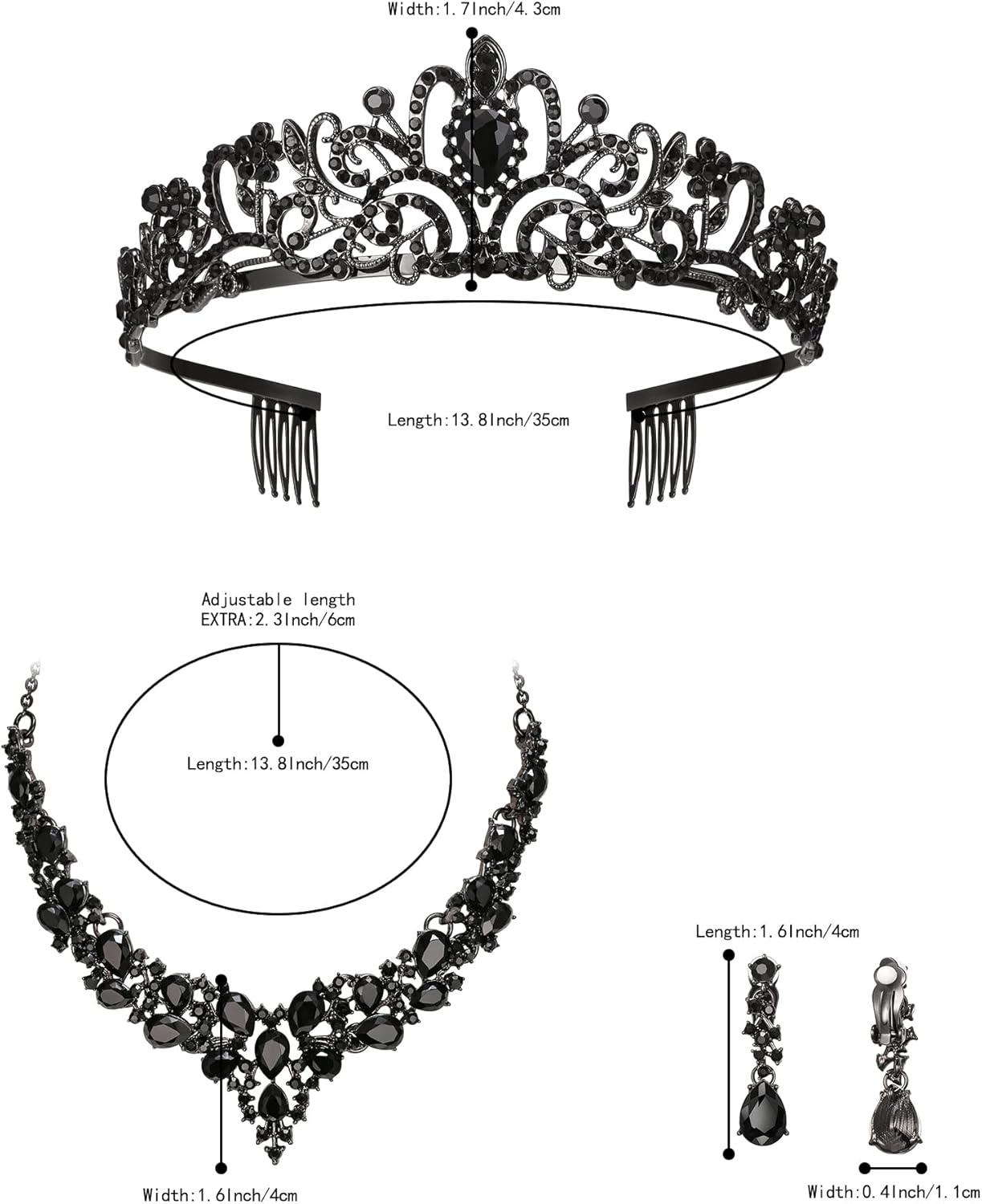 BriLove Alloy Crystal Teardrop Cluster Statement Necklace Clip-on Earrings Tiara Set(Black Black-Tone)