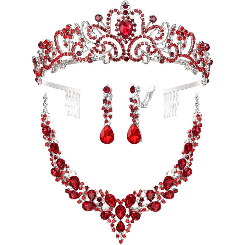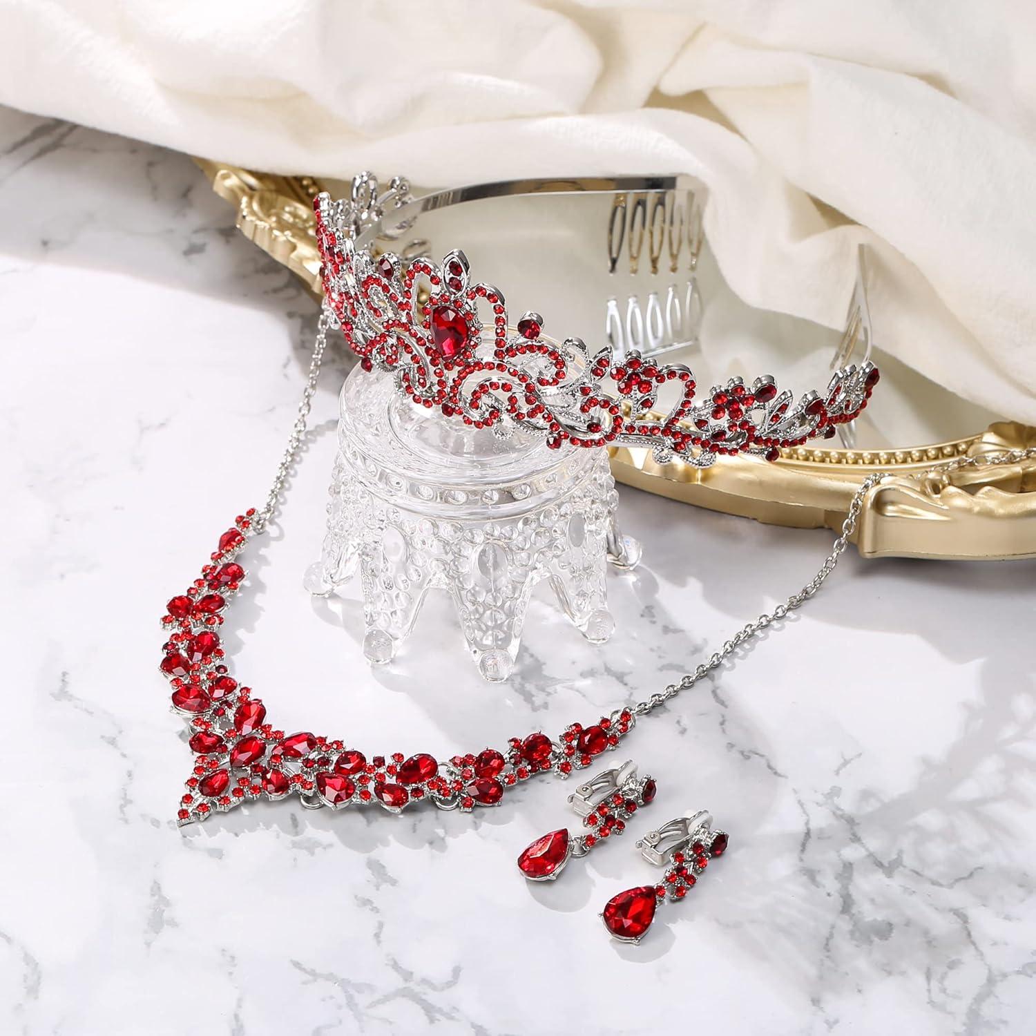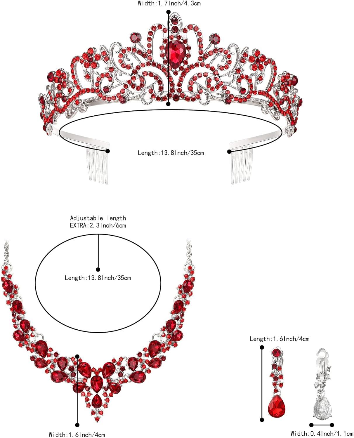 imageBriLove Alloy Crystal Teardrop Cluster Statement Necklace Clipon Earrings Tiara SetRuby Color SilverTone