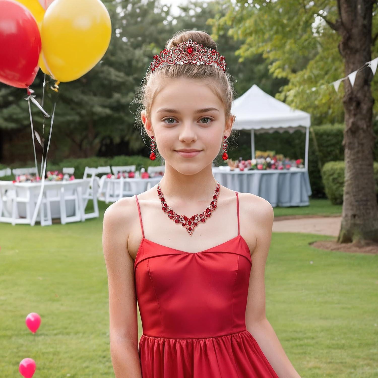 BriLove Alloy Crystal Teardrop Cluster Statement Necklace Clip-on Earrings Tiara Set(Ruby Color Silver-Tone)