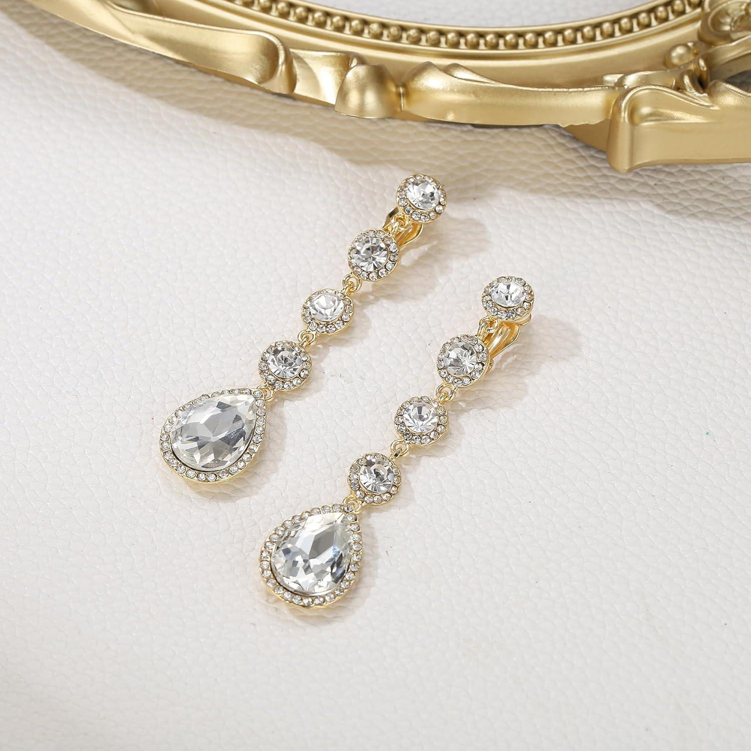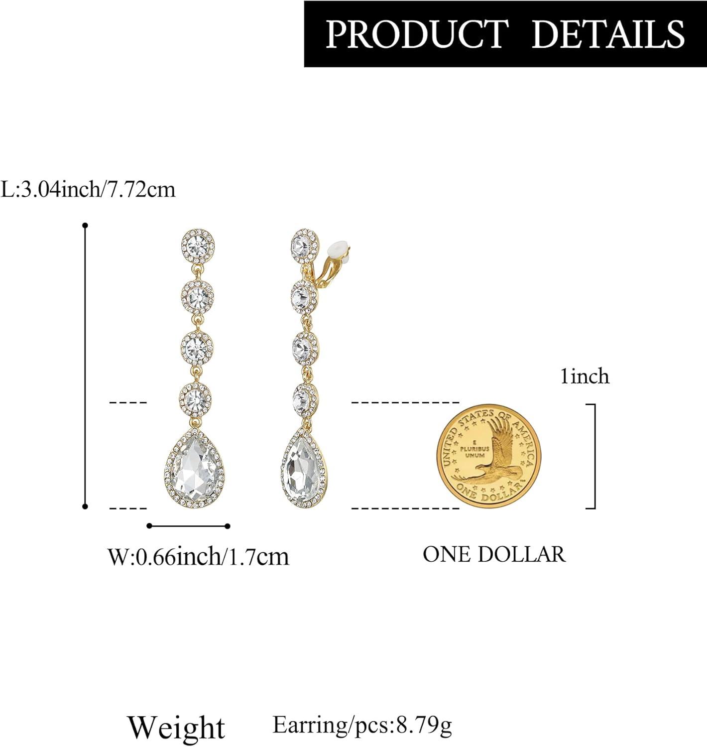 BriLove Clip-on Earrings for Women,Gorgeous Shiny Rhinestones Teardrop Chandelier Long Dangle Earring for Wedding Party Prom Jewelry Accessories(Clear Gold-Tone)