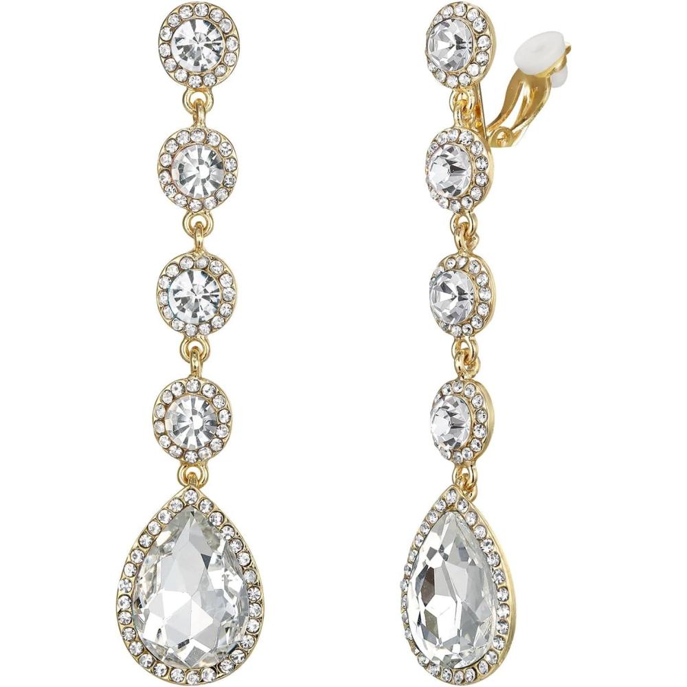 imageBriLove Clipon Earrings for WomenGorgeous Shiny Rhinestones Teardrop Chandelier Long Dangle Earring for Wedding Party Prom Jewelry AccessoriesClear GoldTone
