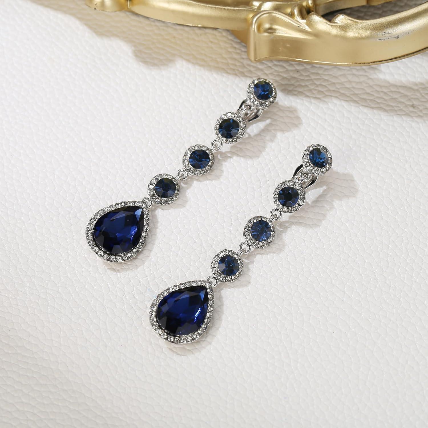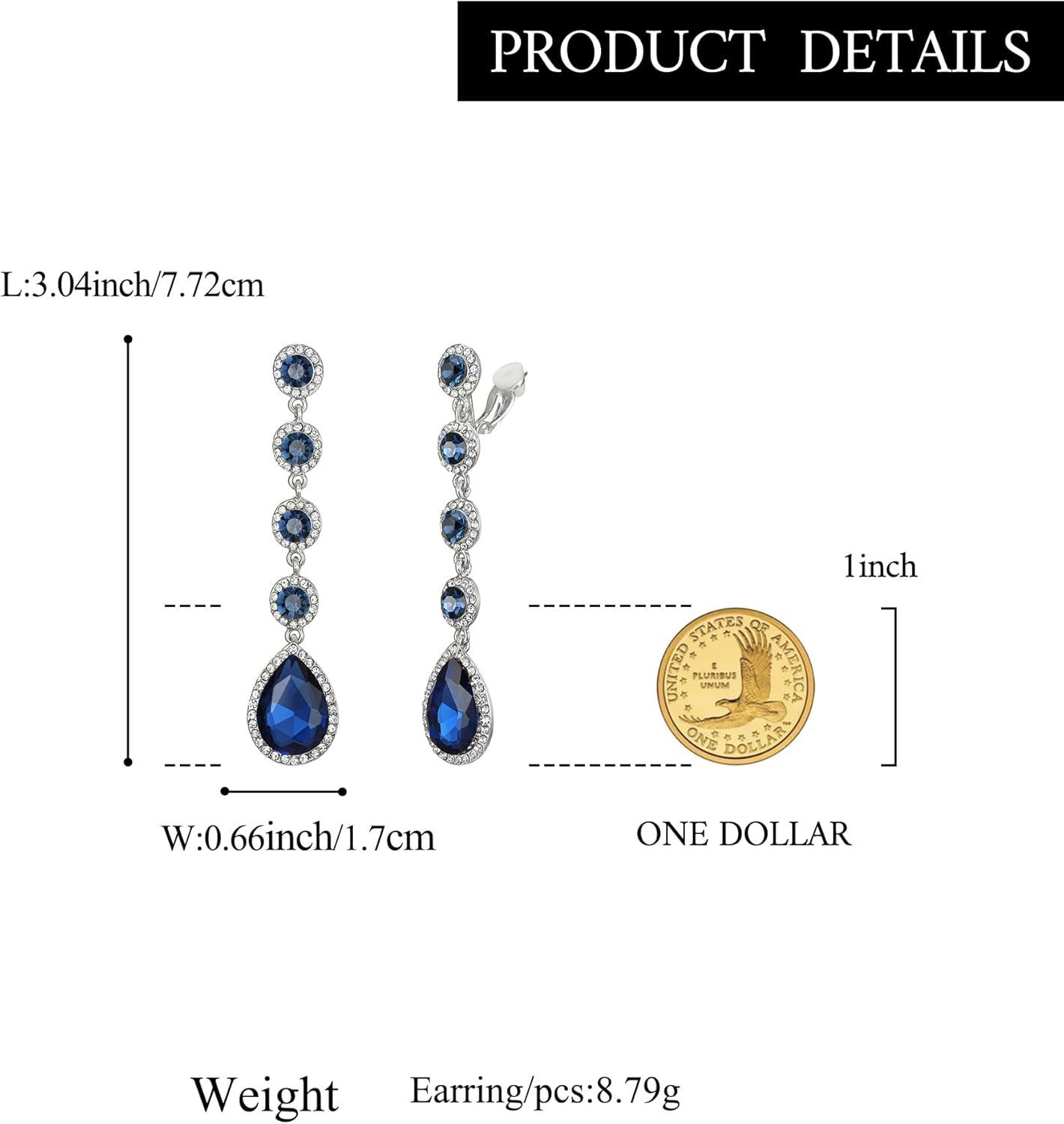 imageBriLove Clipon Earrings for WomenGorgeous Shiny Rhinestones Teardrop Chandelier Long Dangle Earring for Wedding Party Prom Jewelry AccessoriesSapphire Color SilverTone