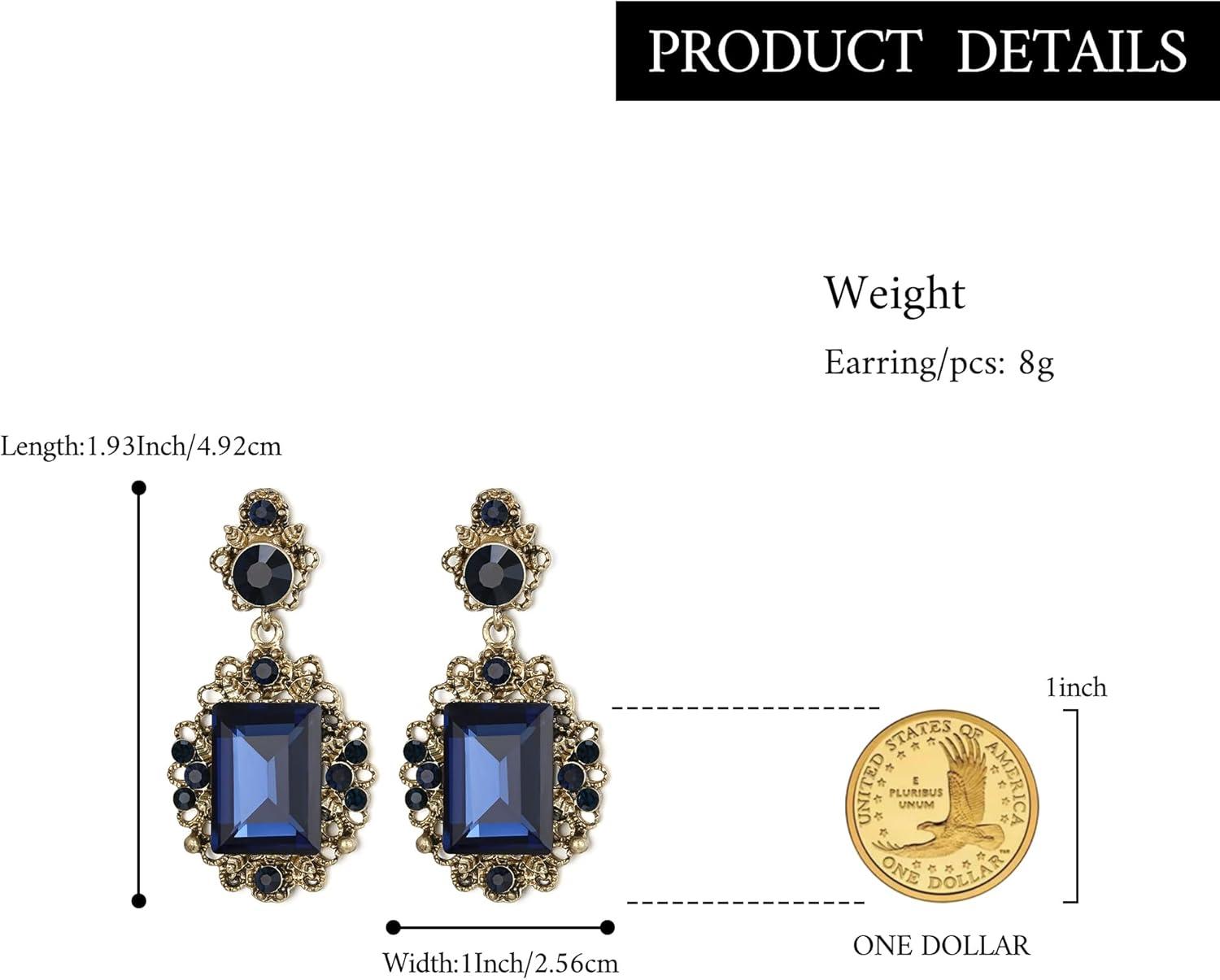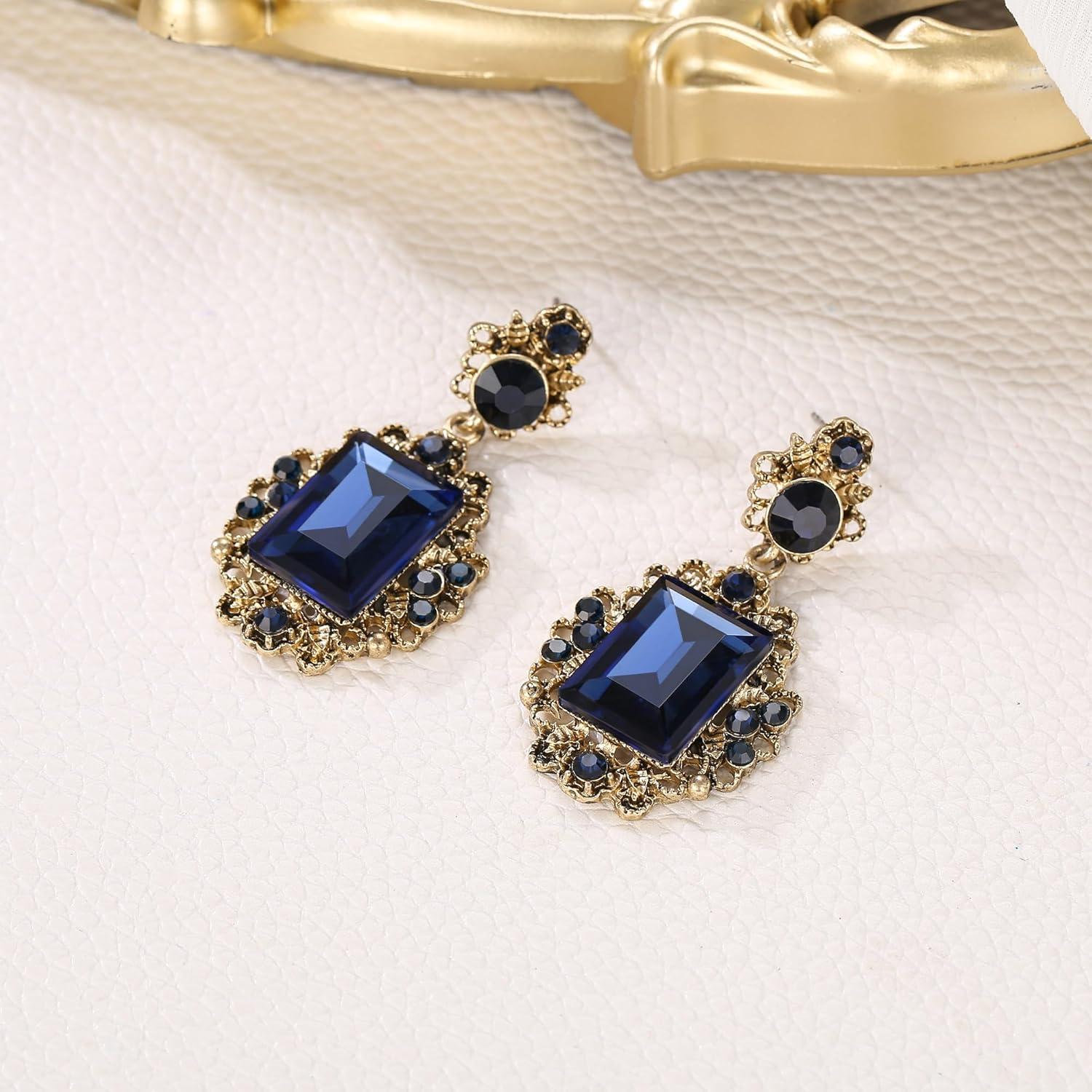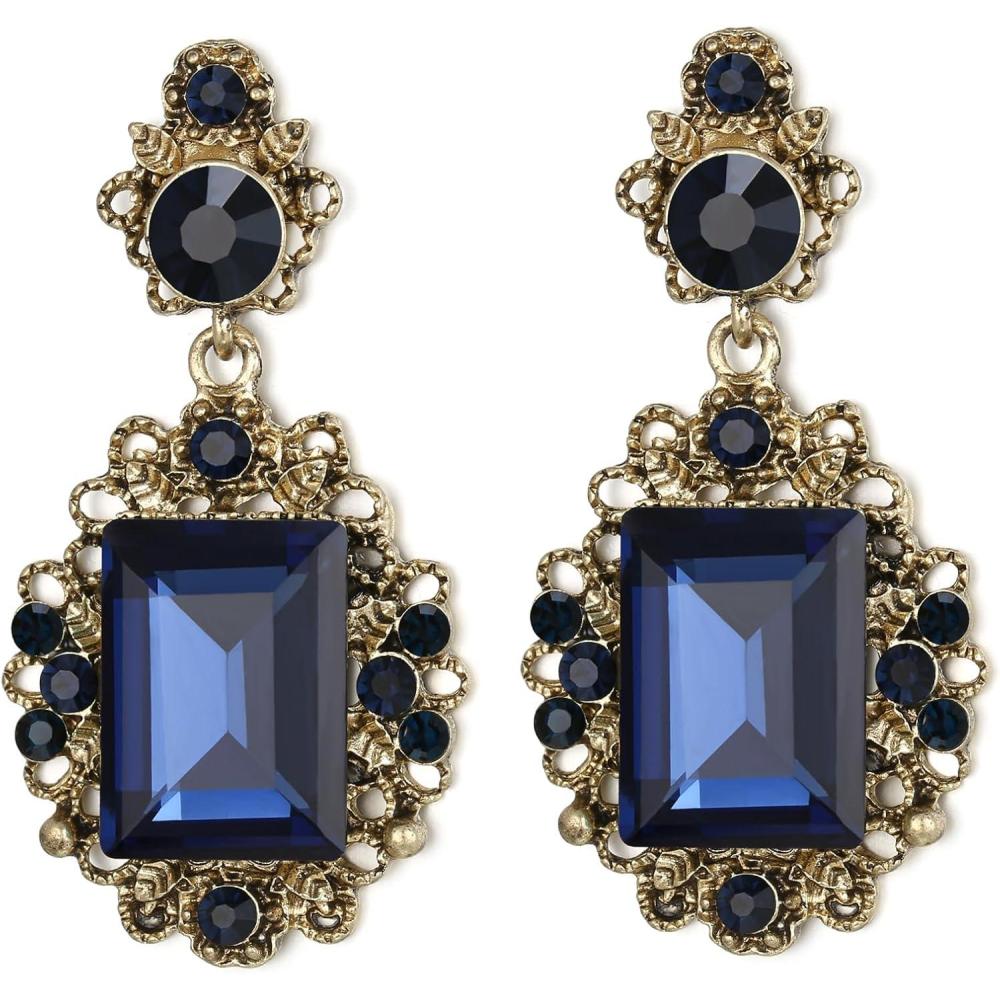 imageBriLove Victorian Style Statement Dangle Pierced Earrings for WomenStunning Shiny Crystal Inspired Emerald Cut Earring for Costume Party Prom Jewelry AcessoriesSapphire Color AntiqueGoldTone