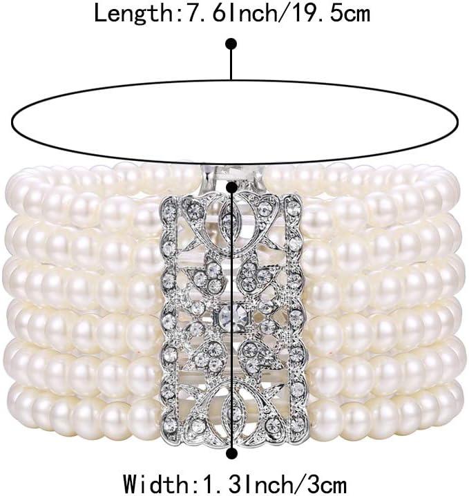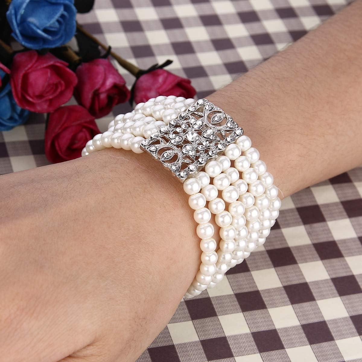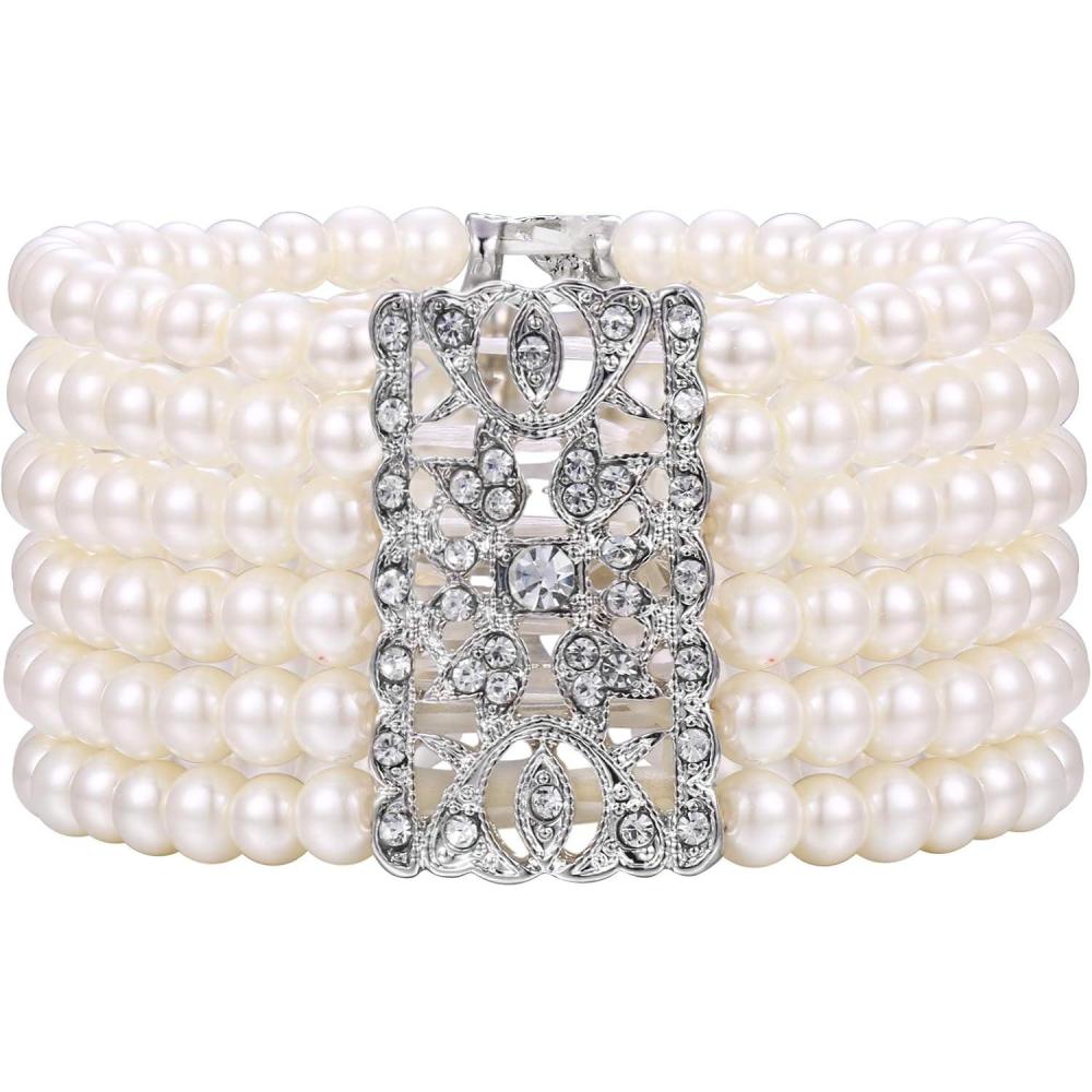 BriLove Women’s Vintage Inspired Crystal Cream Simulated Pearl Hollow Stretch Bracelet Clear Silver-Tone